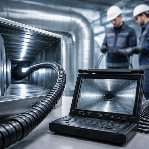 Видеоинспекция представляет собой визуальное обследование вентиляционных каналов с помощью специализированных камер. Метод позволяет без разборки системы определить степень загрязнения, наличие засоров, повреждений или дефектов конструкции. Это особенно удобно для оценки состояния протяжённых и скрытых участков воздуховодов.
